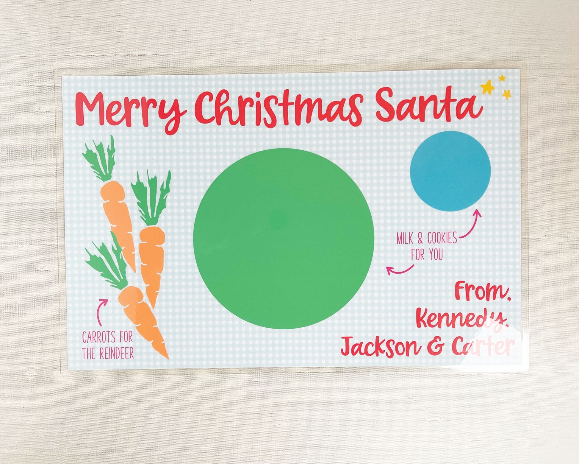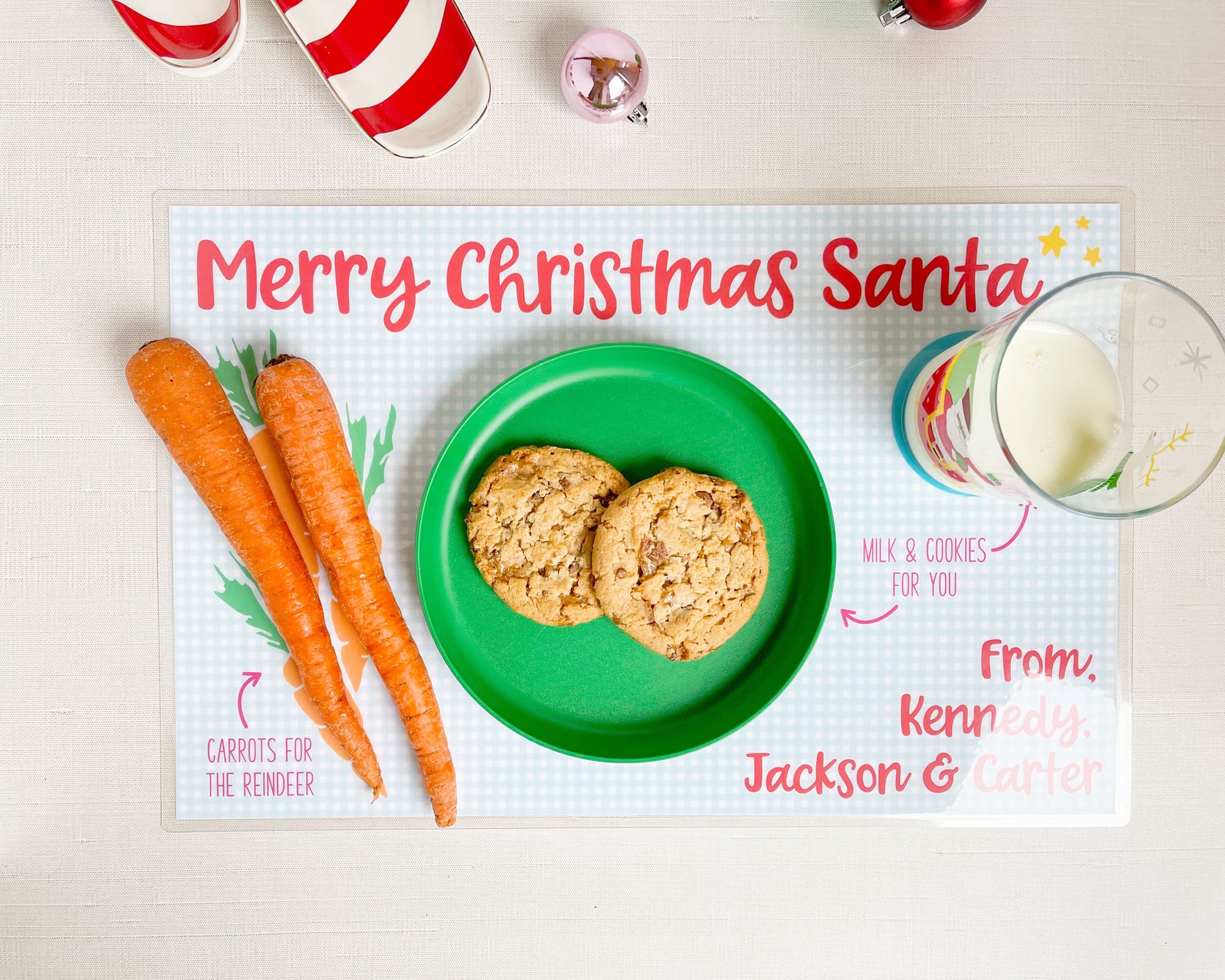 A whimsical Christmas themed placemat featuring a "Merry Christmas Santa" greeting across the top. The rest of the placemat is intended to guide children on where to place all the things needed to leave Santa cookies on Christmas Eve with a few directions printed directly on the mat. Personalization appears at the bottom, right corner.