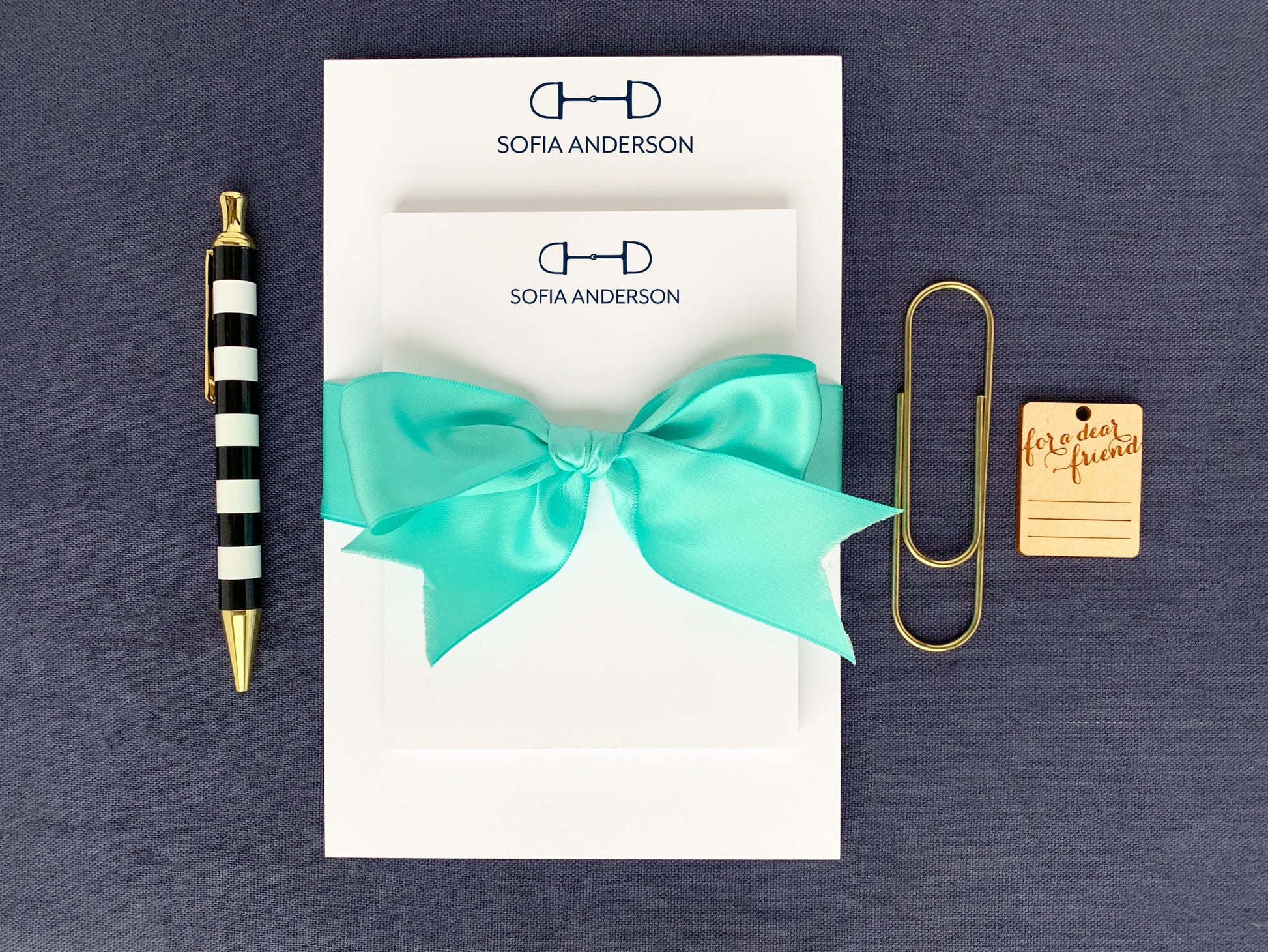 Each notepad features an simple snaffle bit with your full name underneath. This notepad gift set makes a great gift for barn owners, trainers and horse back riding friends.