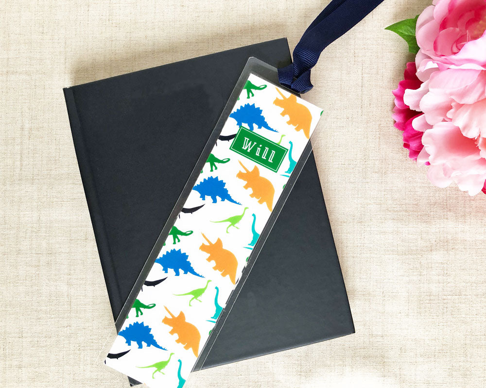 The preppy Dinosaur laminated bookmark is a durable gift for the avid reader on your gift list or for yourself. Each bookmark is printed on each side (same design) and has a thick laminate surrounding it. Available in two pattern options: one for boys and one for girls. Optional ribbon can be attached to the bookmarks. Navy blue grosgrain ribbon is used on with the boy pattern and pink is used with the girl pattern. These bookmarks measure 2” wide by 8” tall.