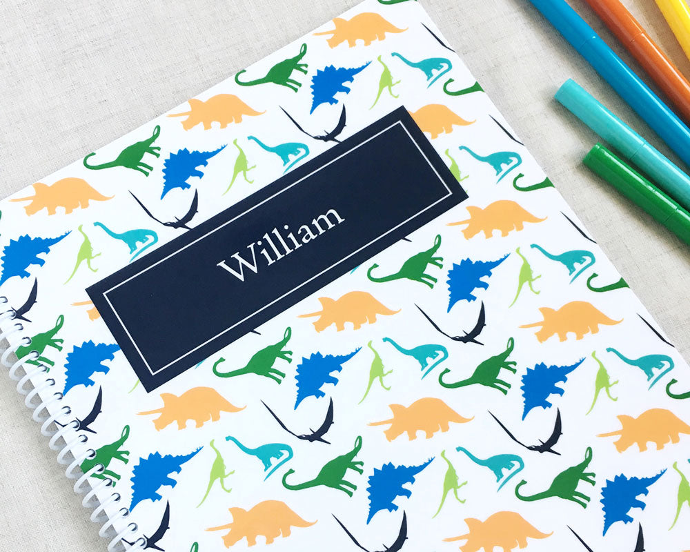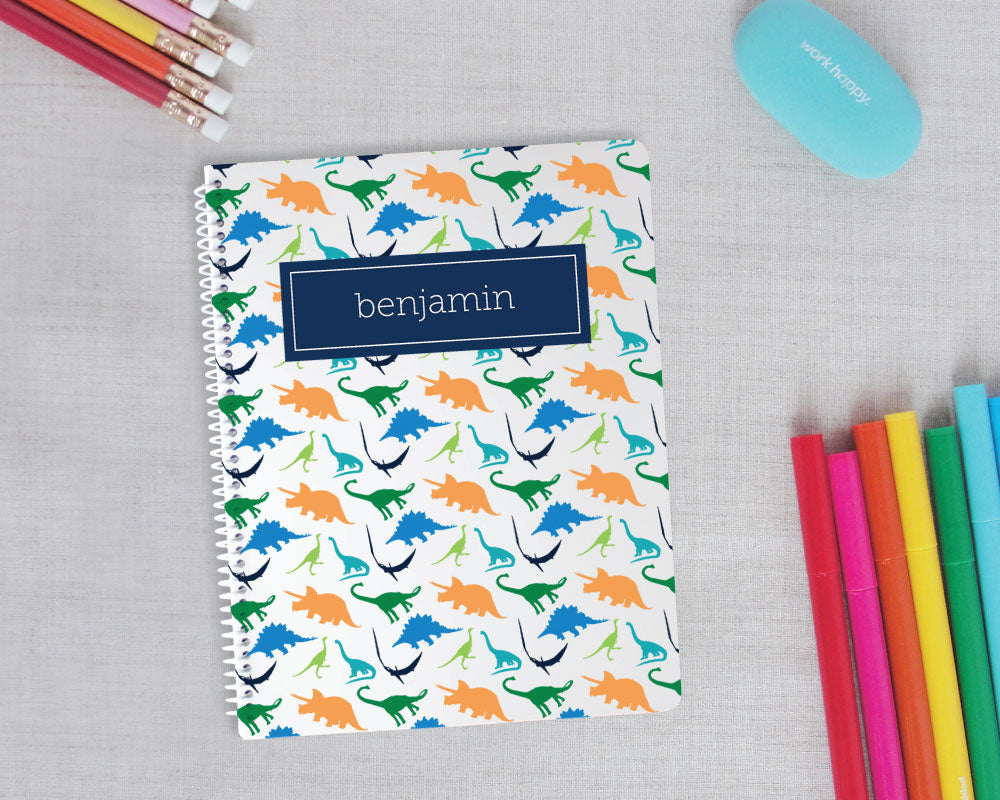 This personalized dinosaur spiral bound notebook is a perfect gift for kids. Available in two sizes: regular and mini, these notebooks are perfect for note taking and journaling. The dinosaur pattern features six different dinosaur silhouettes. Personalize the notebook with either a full name printed on a rectangle or choose from one of the monogram options. This design is available in a boy or girl color scheme.
