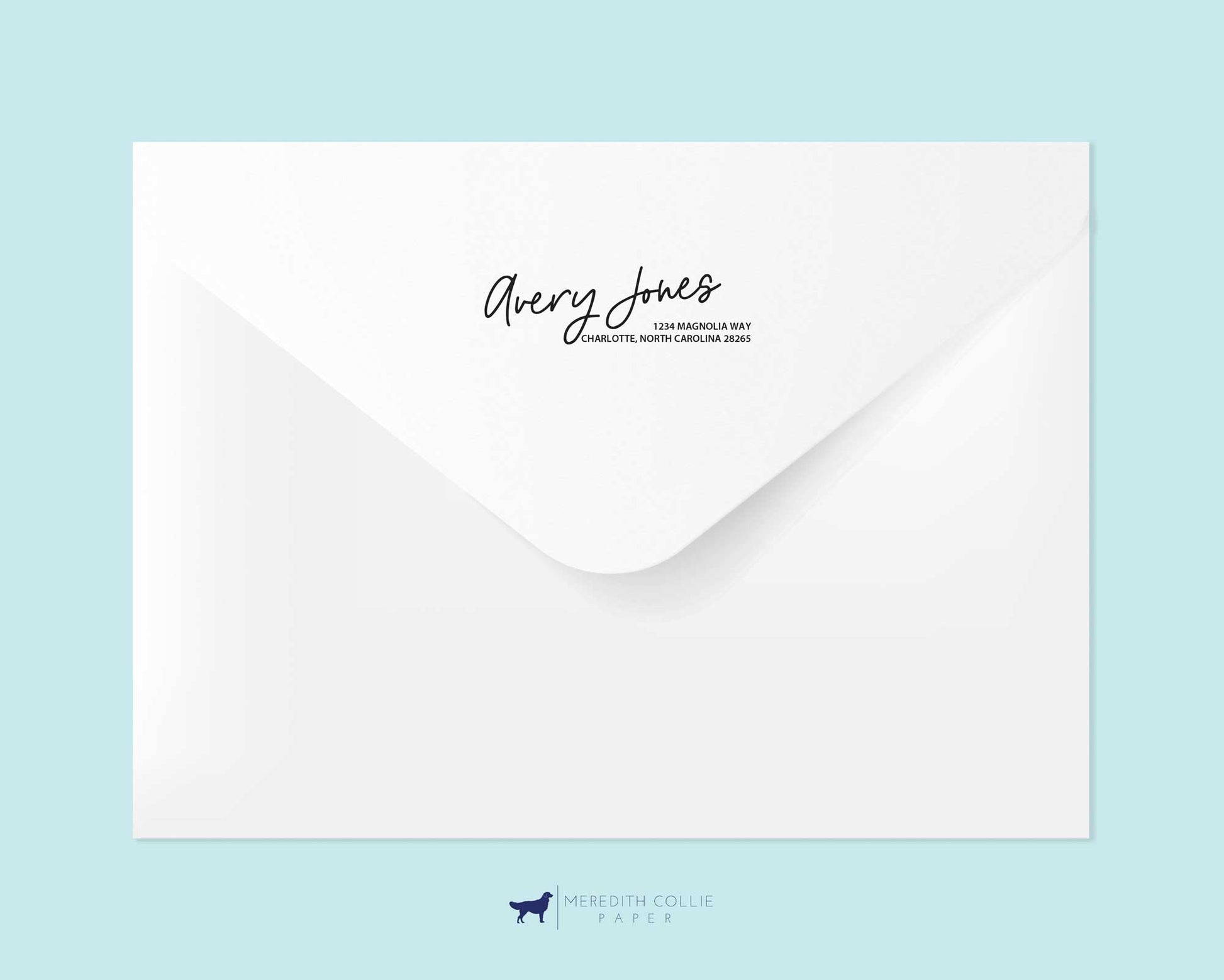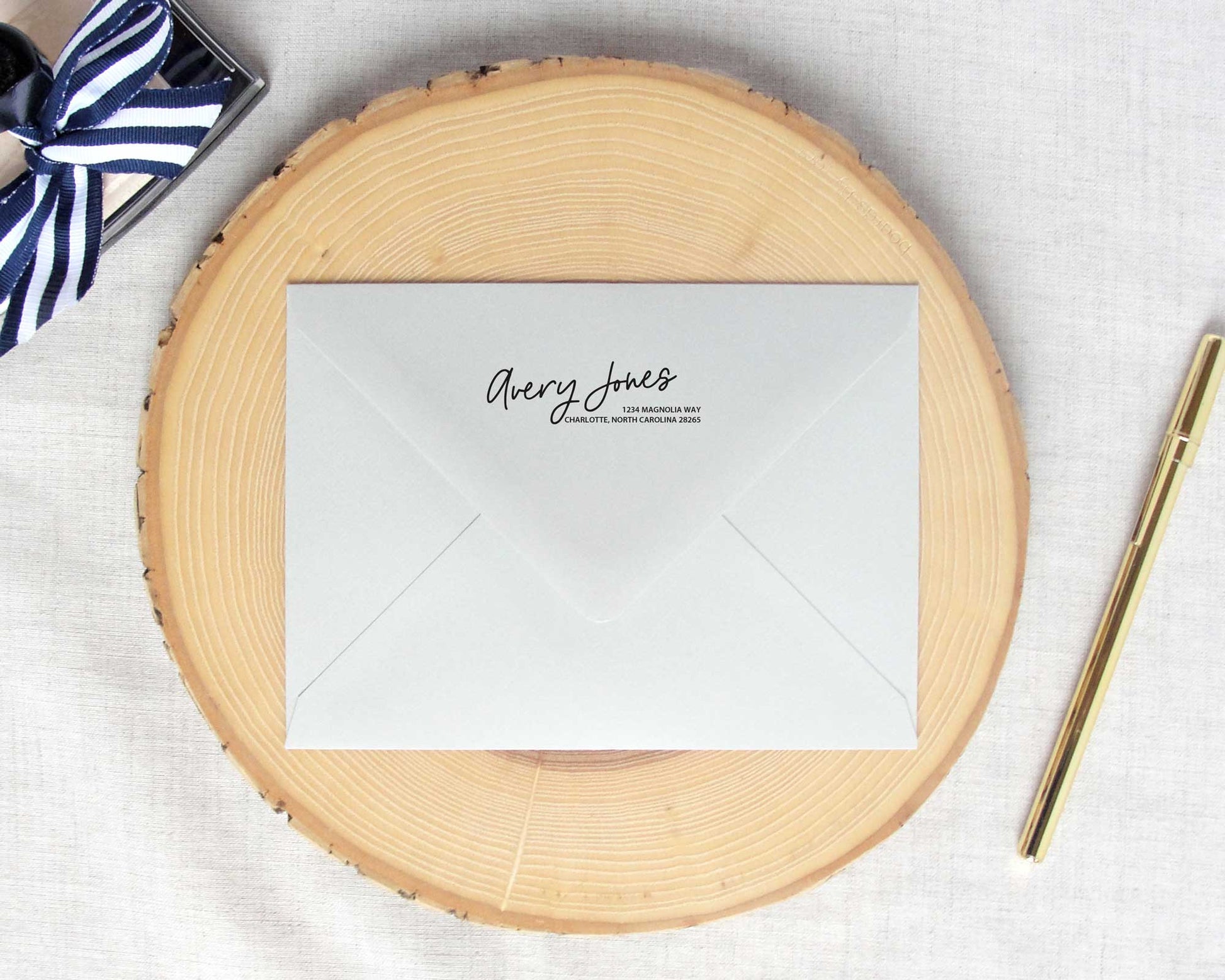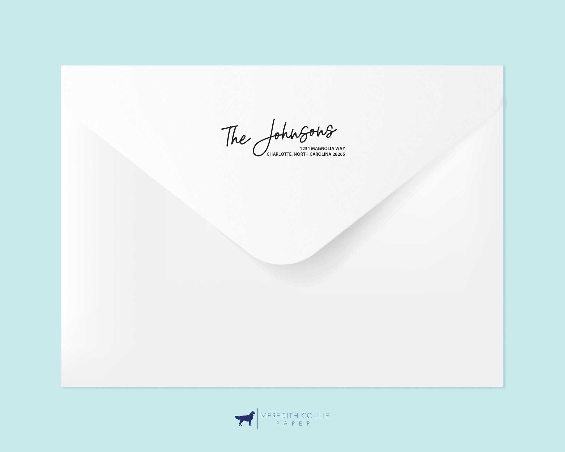 This pretty return address stamp design features your family name in a modern, handwriting style script font. Underneath is your address printed in a complimentary font.