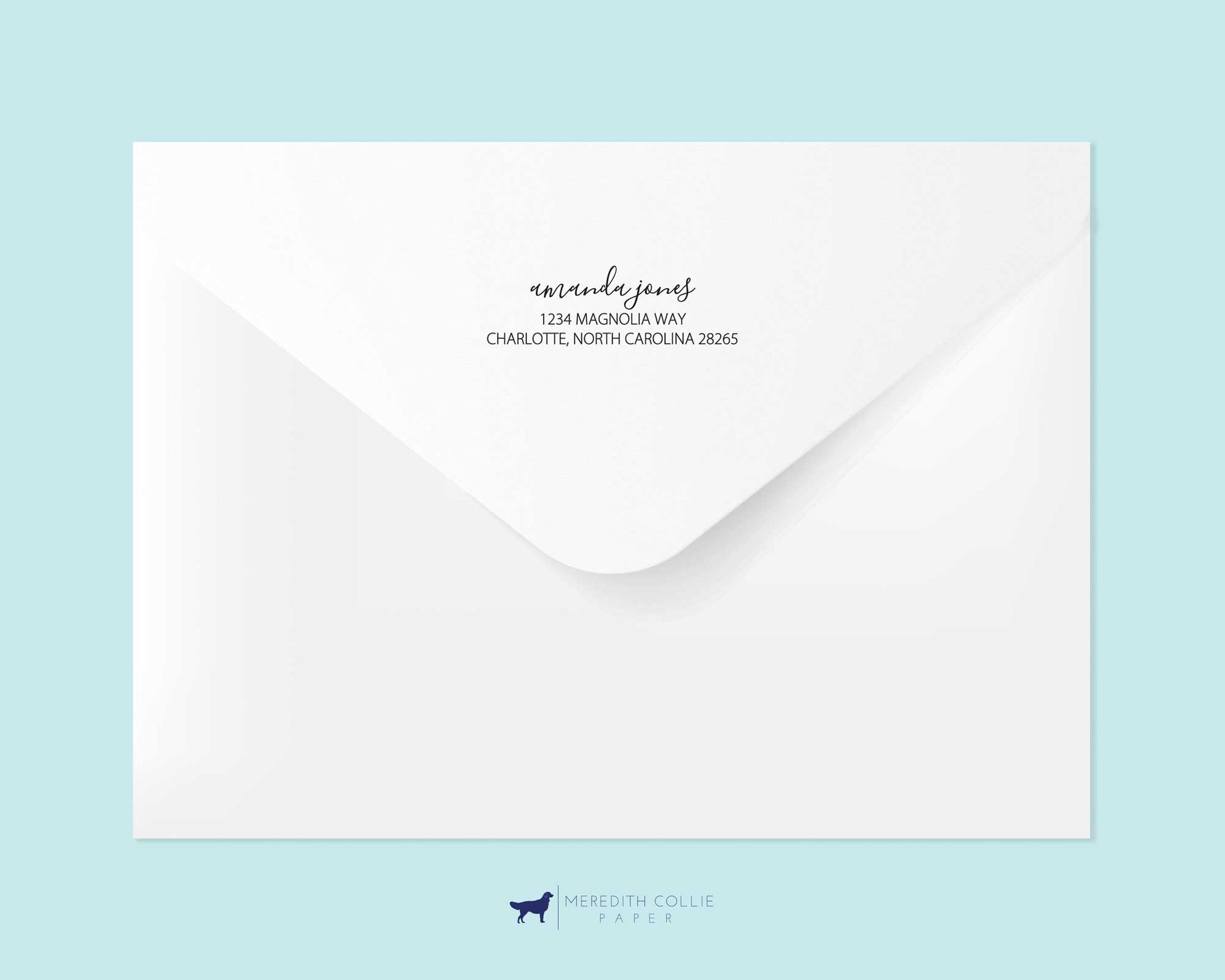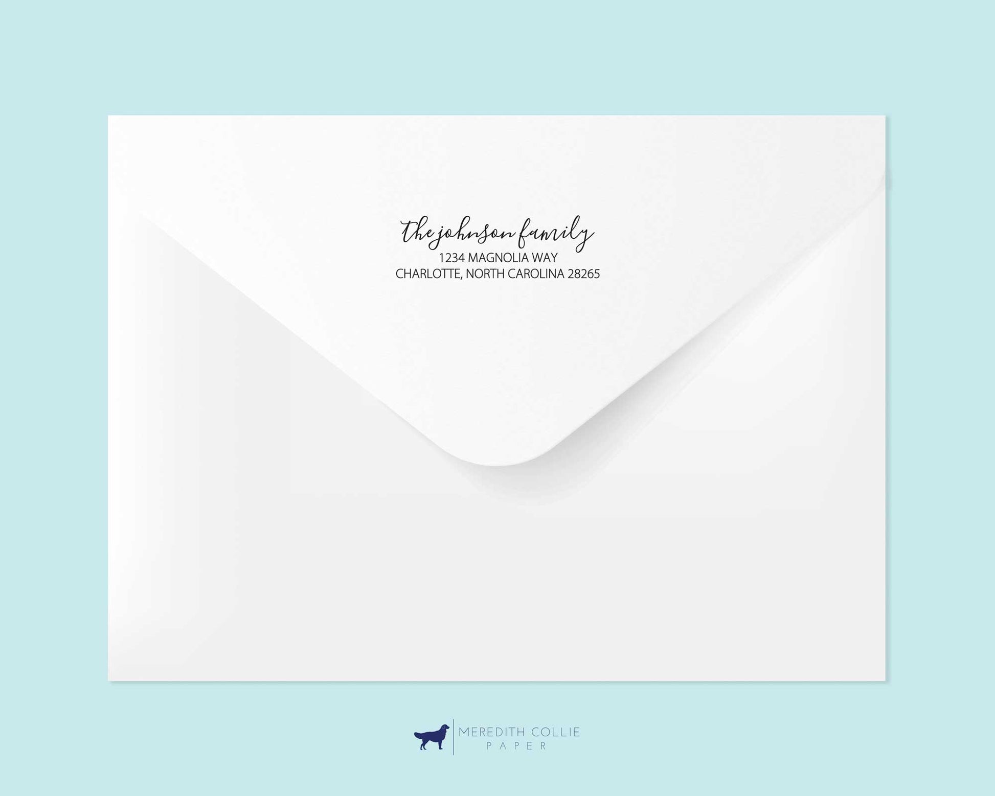 This pretty return address stamp design features your name in an elegant script font. Underneath is your address printed in a complimentary font.