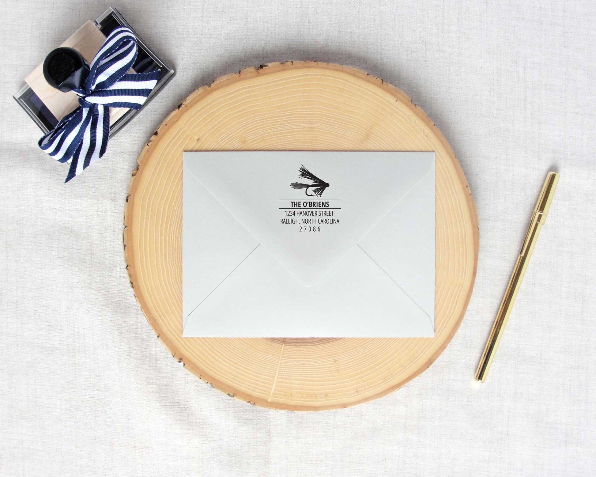 Each stamp features a silhouette of a fly fishing lure and comes personalized with the your name and address. A return address stamp for the outdoor enthusiast and sportsman who has a classic taste when it comes to design aesthetic.