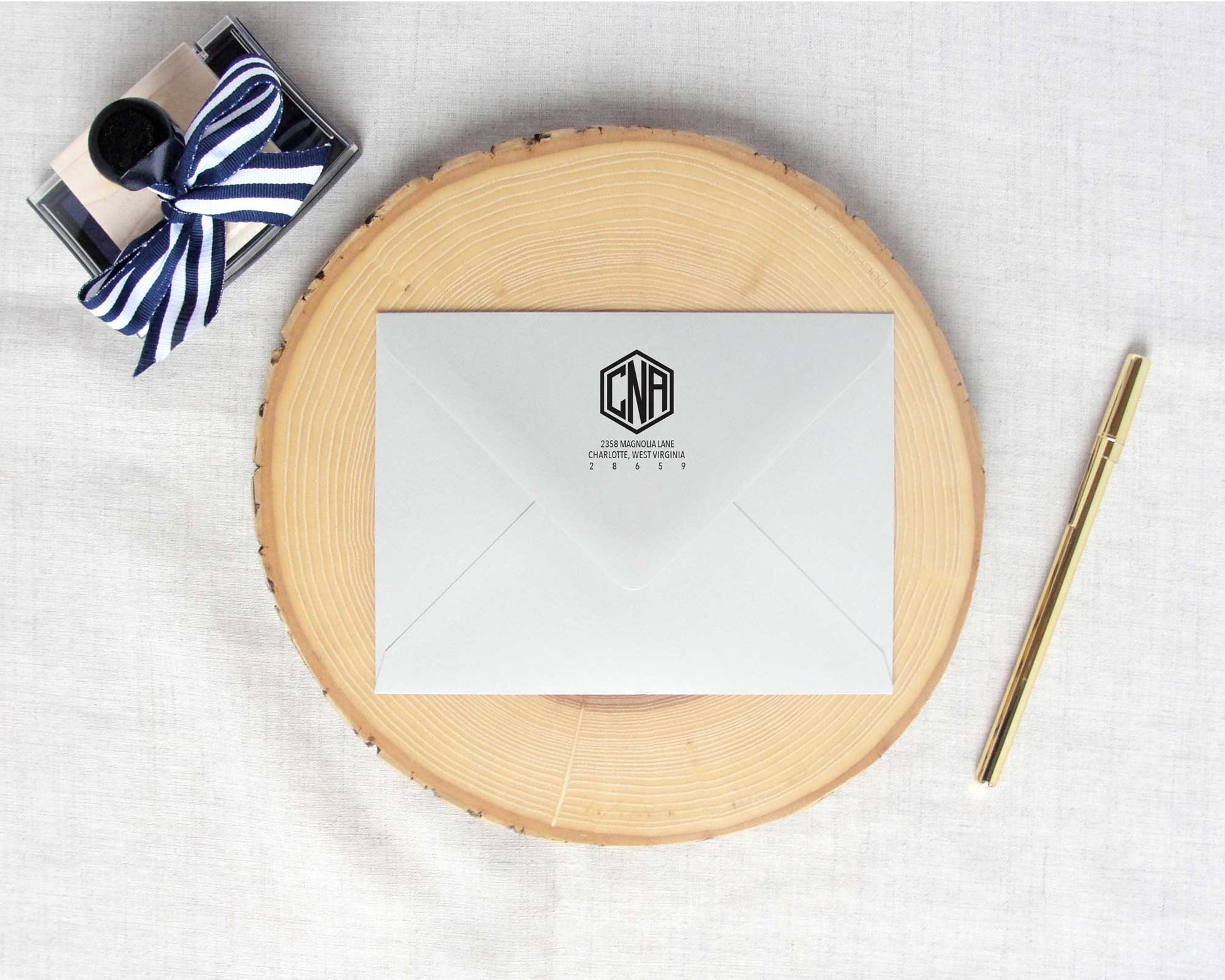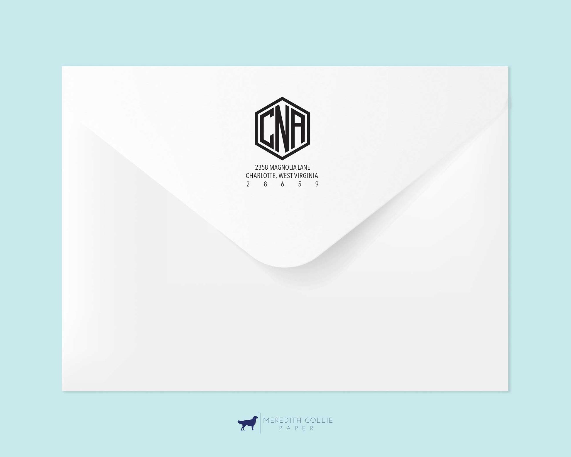 The hexagon monogram return address stamp features your first, middle and last name initial with the last name initial in the center. Your address appears below the monogram. For more information about monogram styles and etiquette, please refer to this blog post.