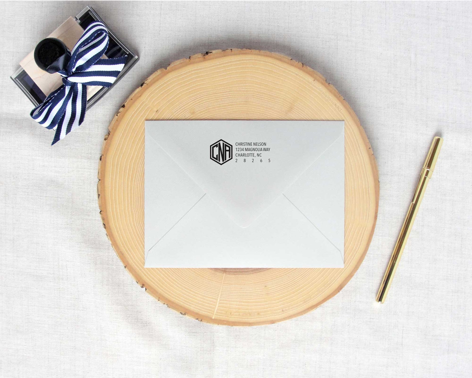 The hexagon monogram return address stamp features your three initial monogram to the left of your full name and address.