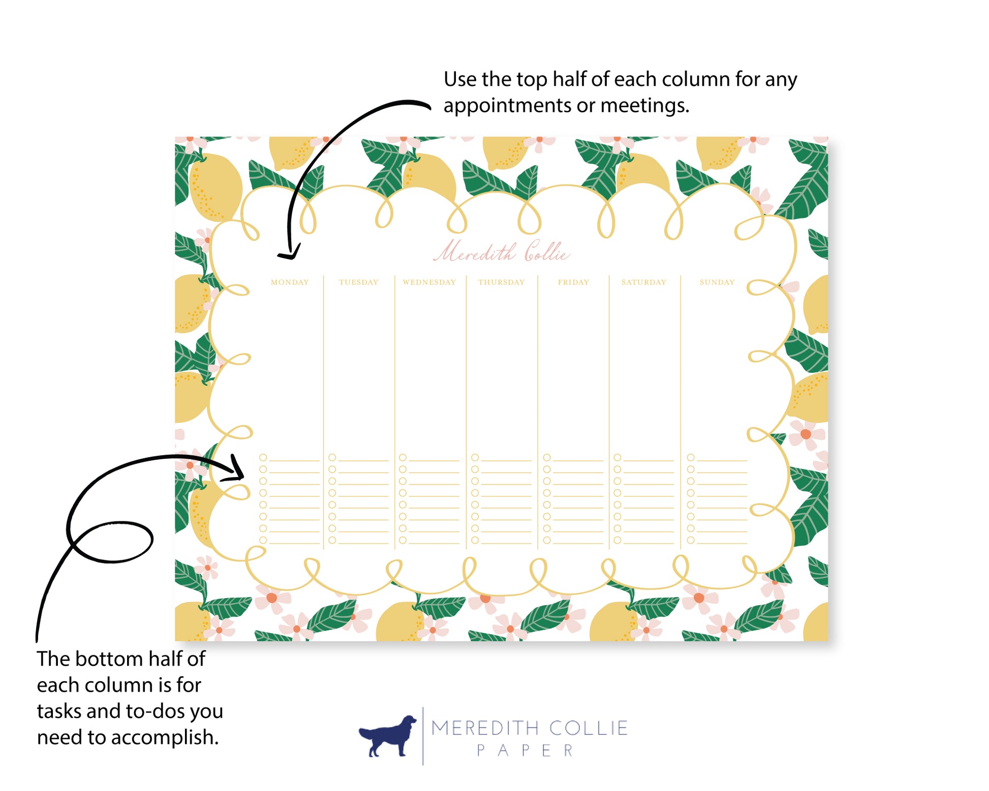 Your desk just got sunnier. This large weekly notepad features a bright lemon floral design and your custom name — perfect for planning, scheduling, and freshening up your workspace.