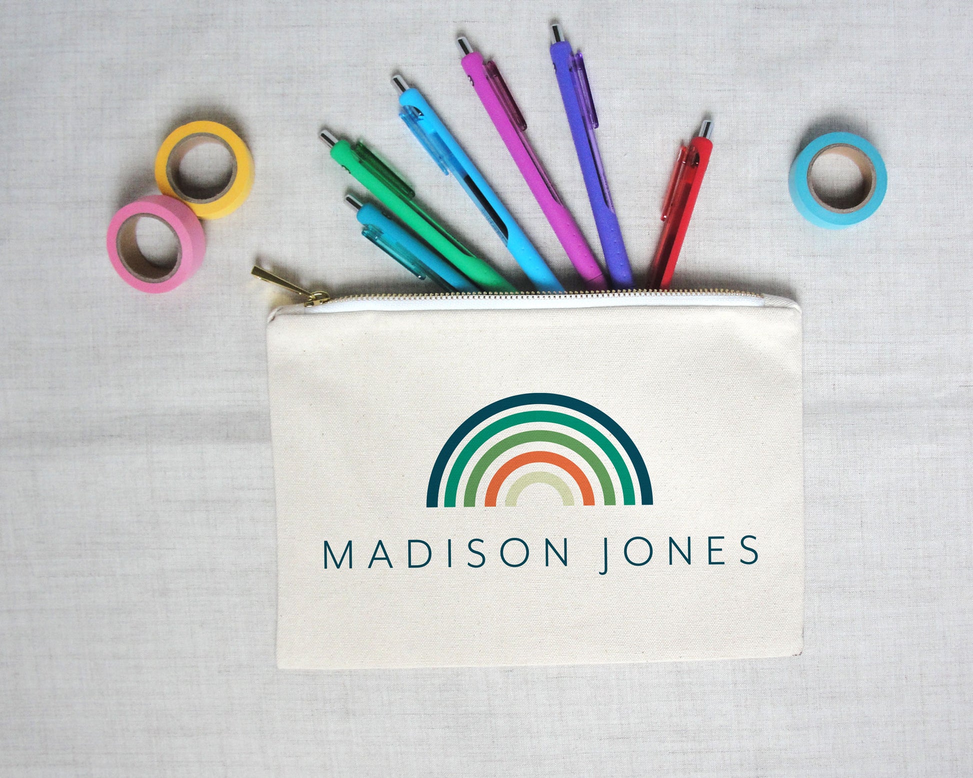 This modern rainbow personalize pencil pouch features a very geometric rainbow with your name directly underneath. Available in three color palettes: bright, pastel and blue. Your name is printed in the same color as the outer most band of the rainbow color palette. A great design for tweens, teens and adults who love rainbows but are looking for something more modern rather than whimsical.