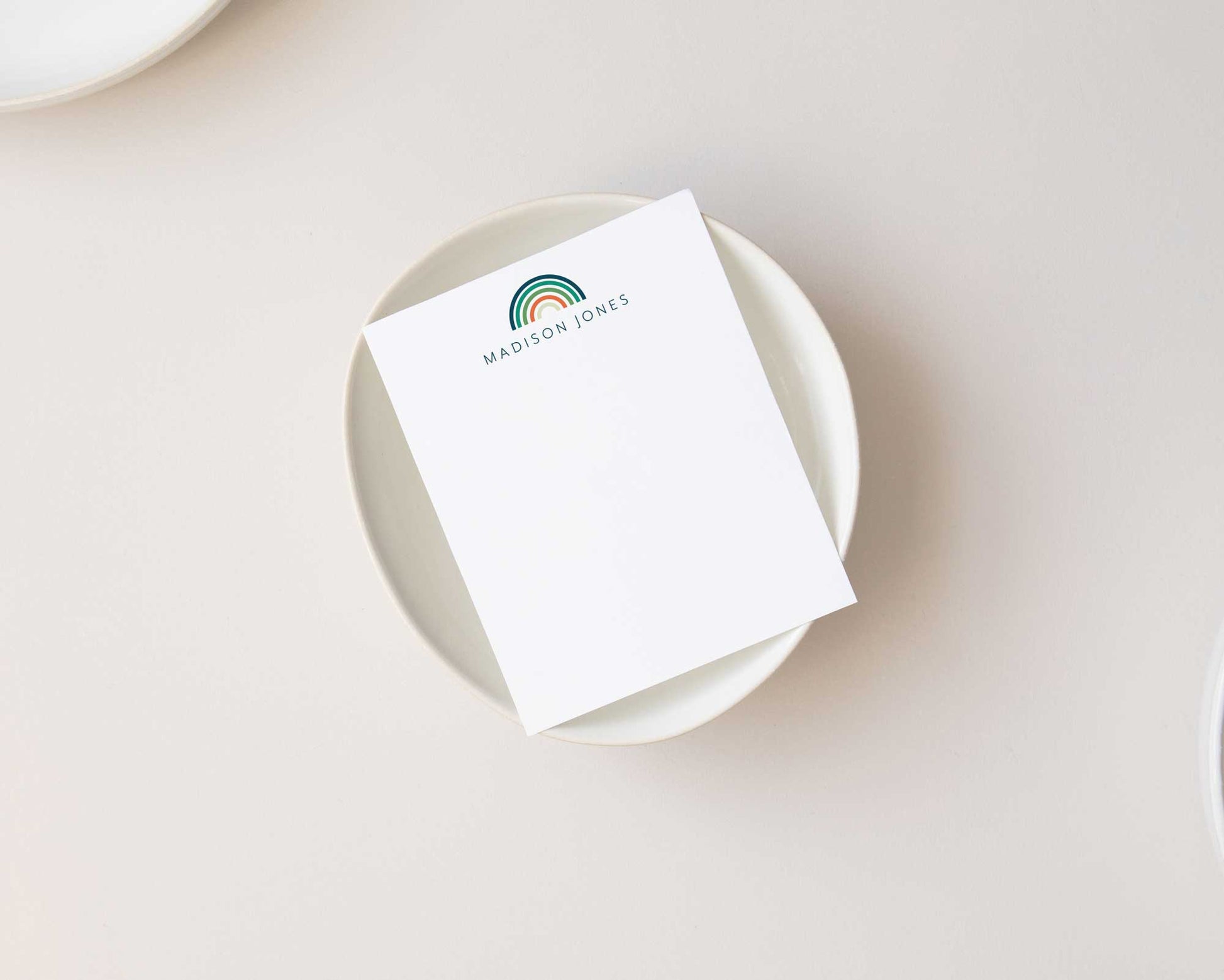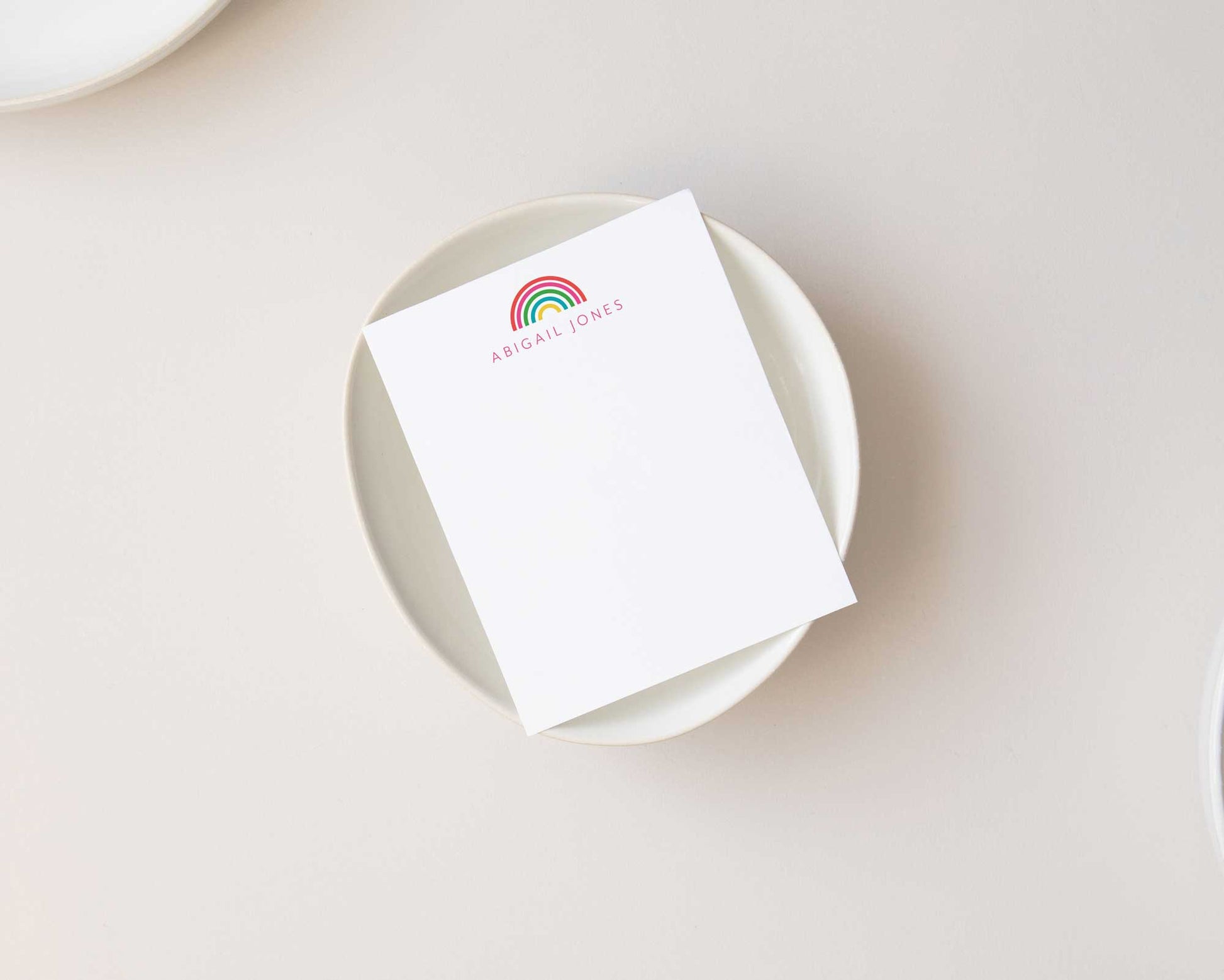 This modern rainbow personalize stationery features a very geometric rainbow with your name directly underneath. Available in three color palettes: bright, pastel and blue. Your name is printed in the same color as the outer most band of the rainbow color palette. A great design for tweens, teens and adults who love rainbows but are looking for something more modern rather than whimsical.