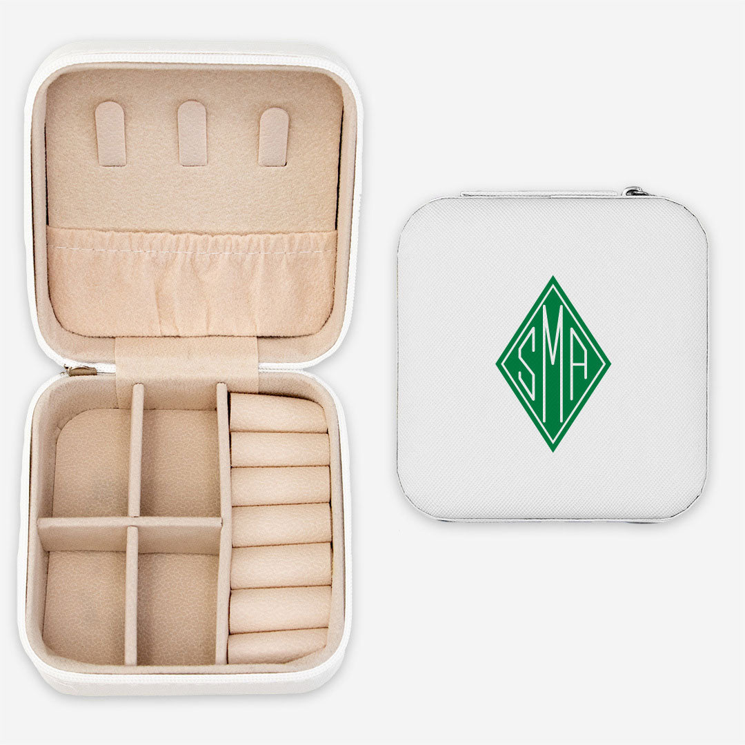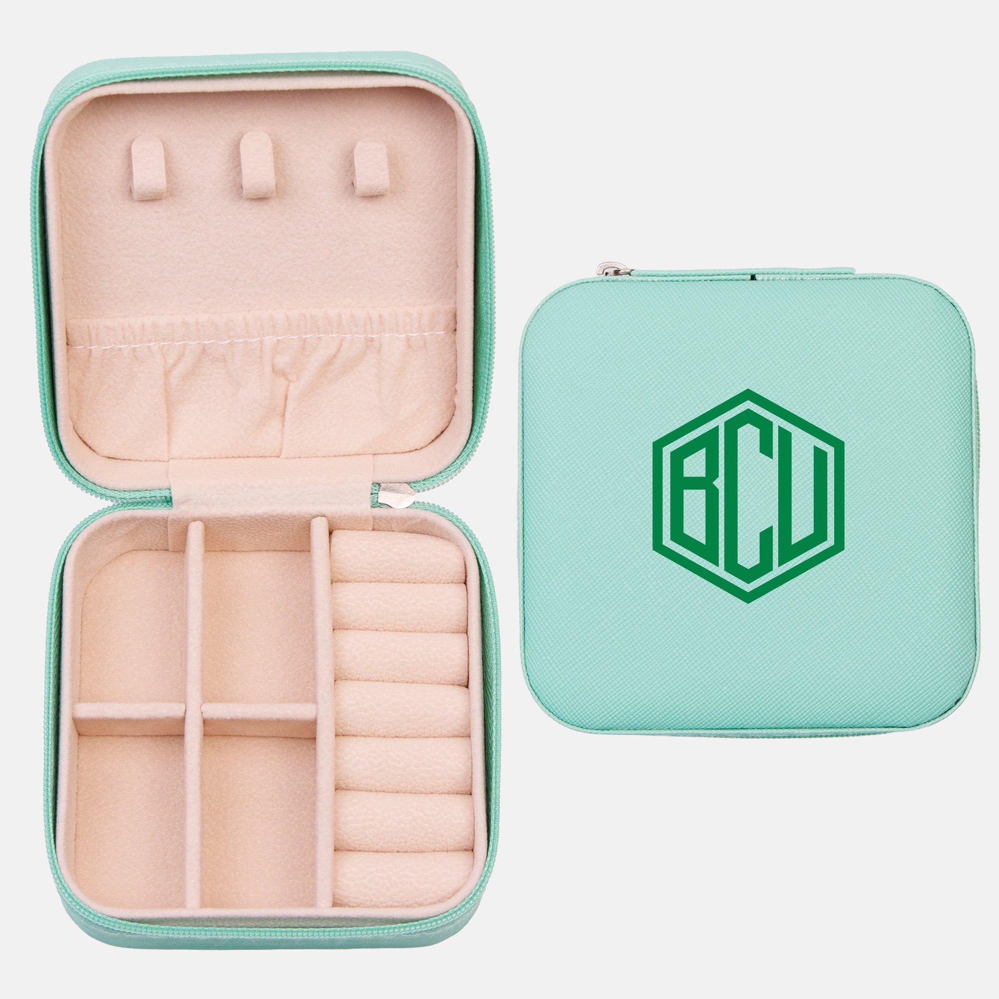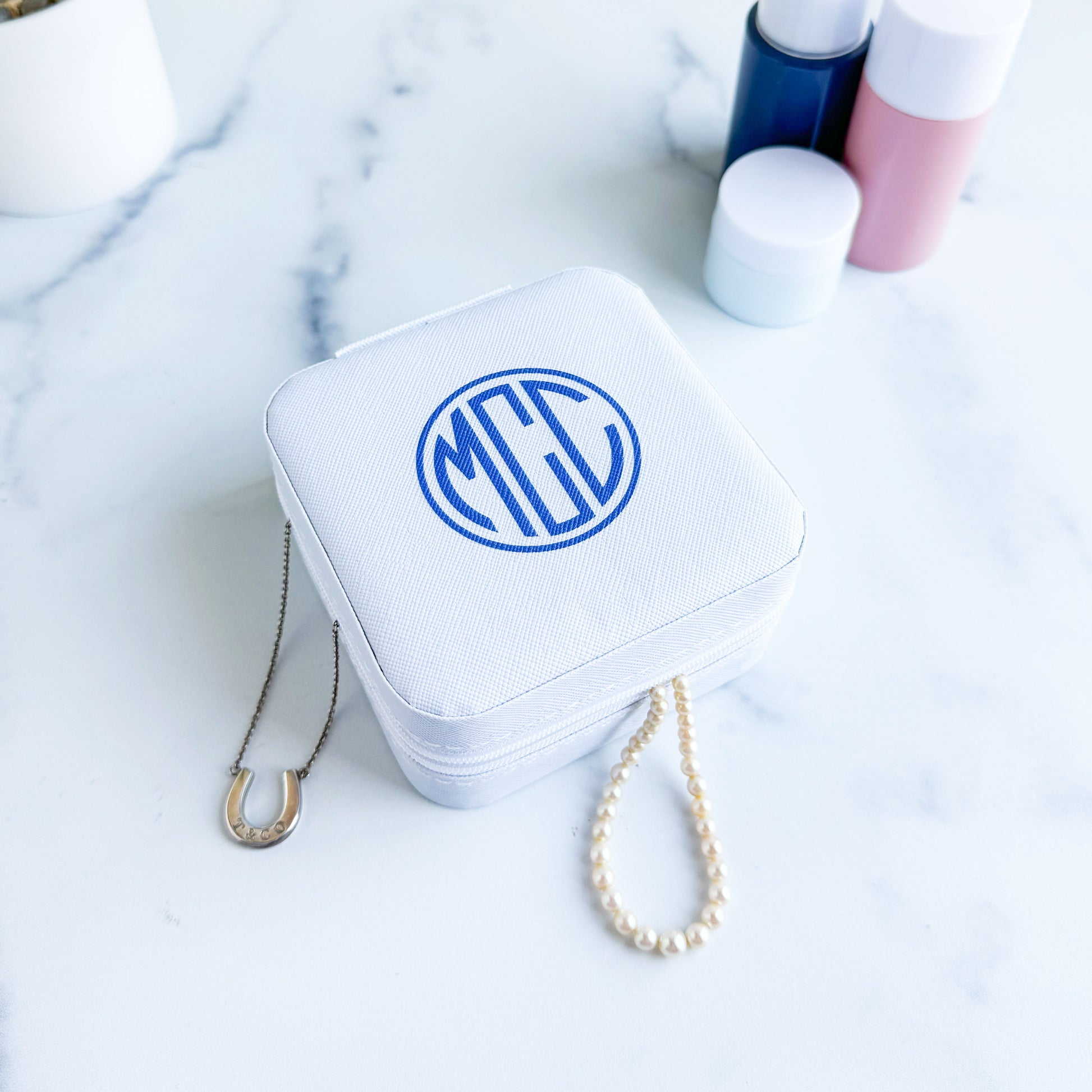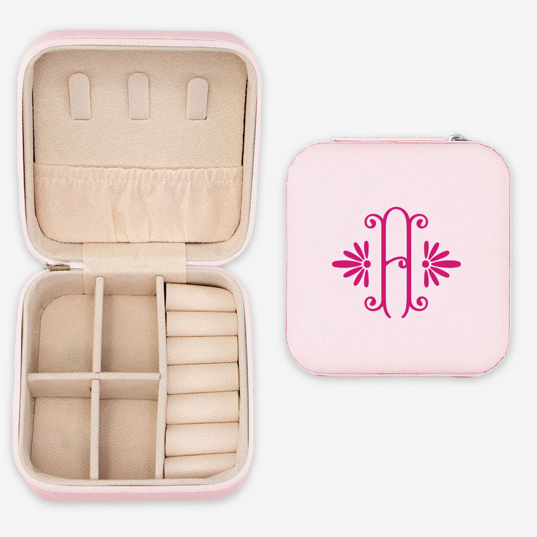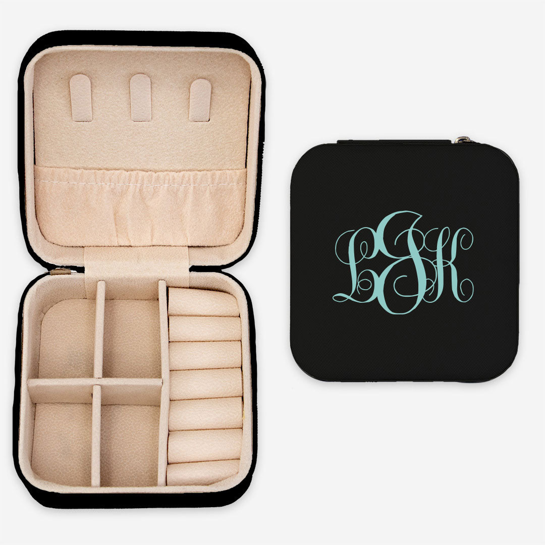 Organize your accessories in style with our monogram travel jewelry case. Perfect for birthday, Mother's Day or graduation gifts, this leatherette case is personalized with your monogram choice. Keep all of your jewelry safe and organized while traveling.