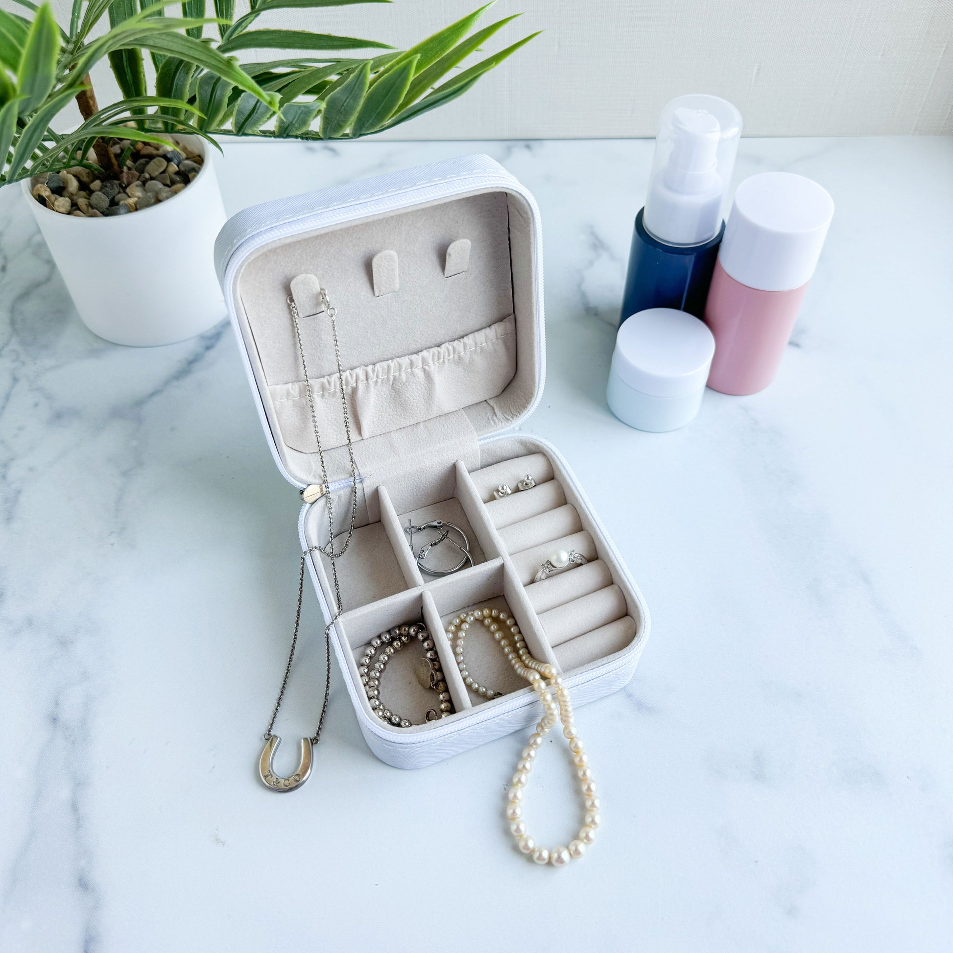 Each jewelry box has space to organize rings, earrings and necklaces for your next trip.