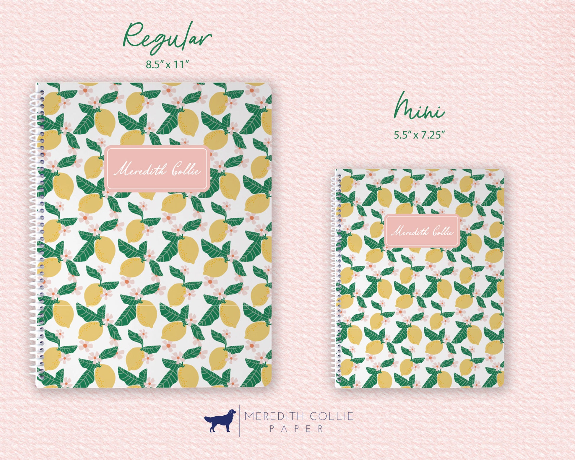 1. Mini / Lined Pages: Each personalized mini spiral notebook measures 5.5" x 7.25" and contains 47 sheets of lined paper. Each page is double-sided. Each notebook has white spiral binding and a matte front and back cover. The pattern appears on both the front and back cover. Personalization only appears on the front cover.