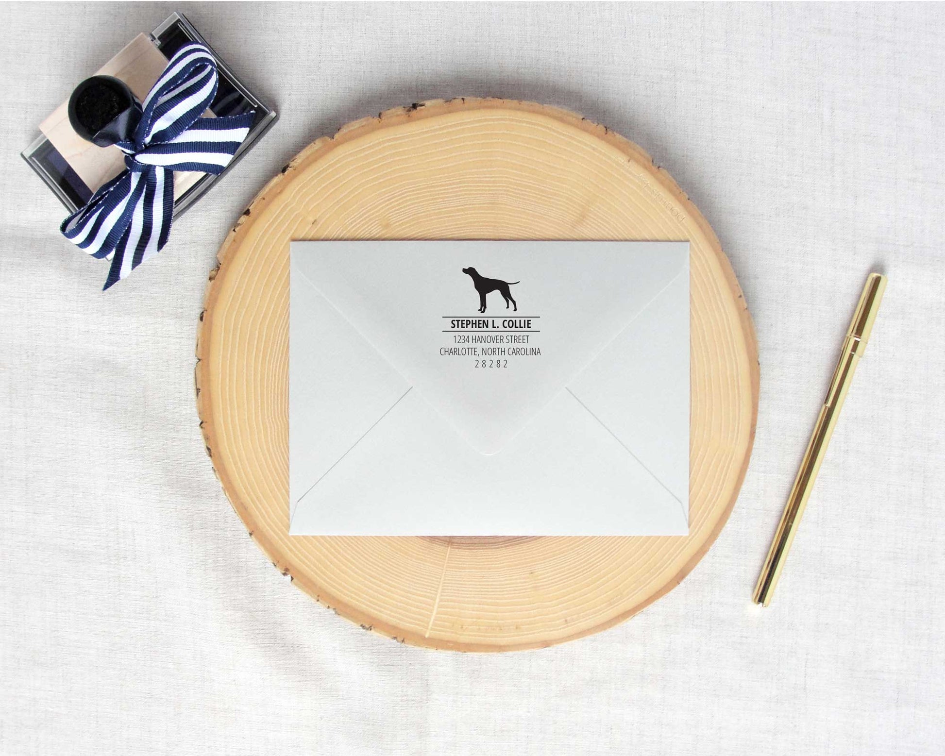 Each stamp features a pointer dog silhouette and comes personalized with the your name and address. A return address stamp for the outdoor enthusiast and sportsman who has a classic taste when it comes to design aesthetic.