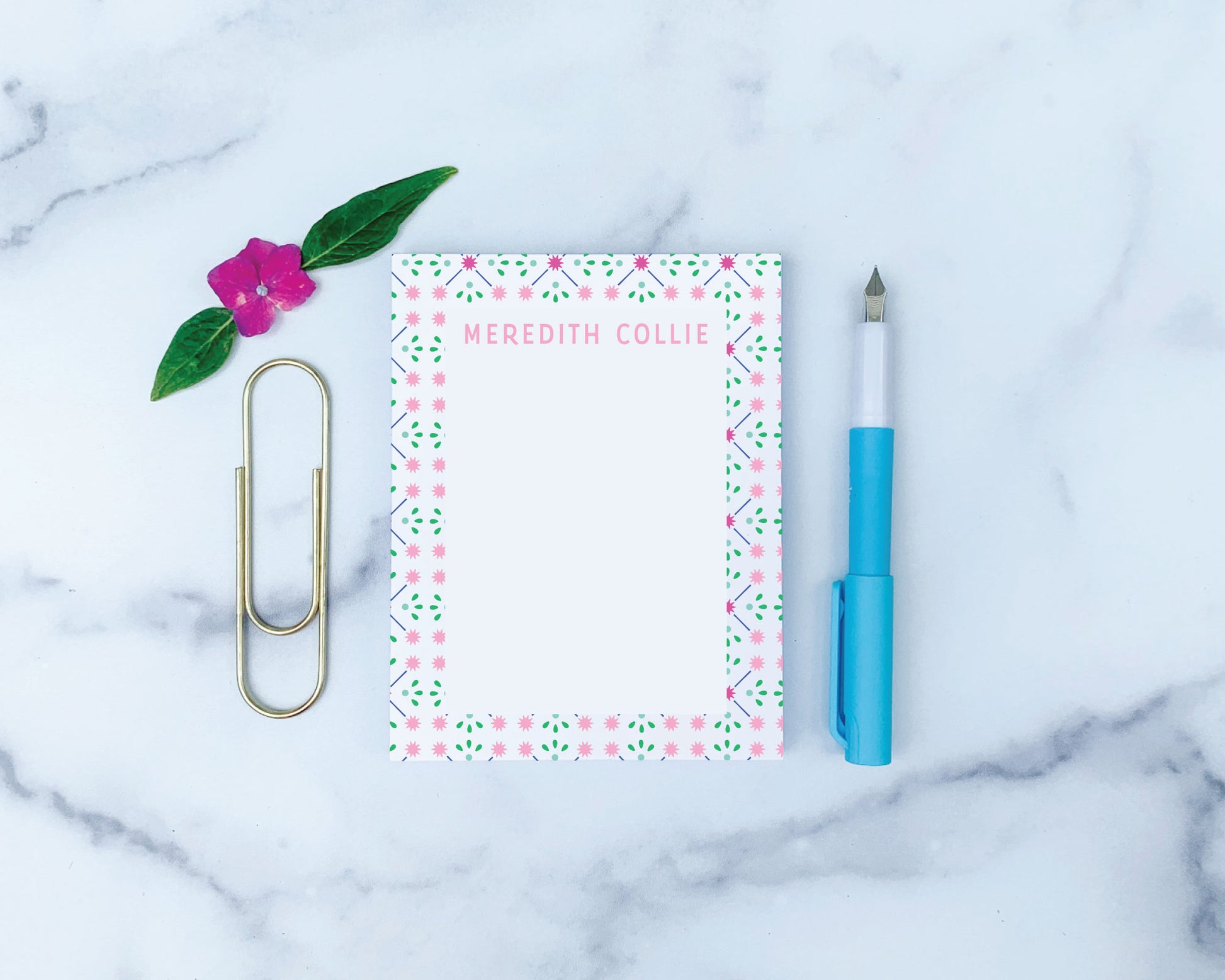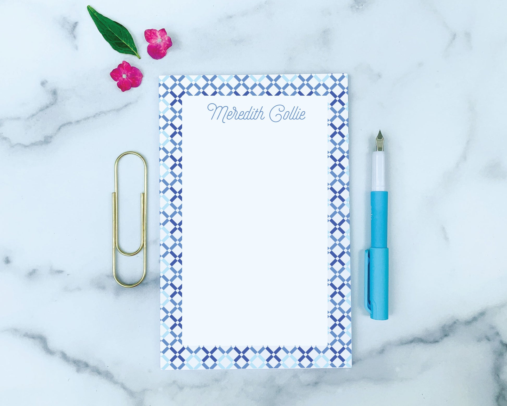 Inspired by classic, Portuguese tile designs, this personalized notepad is perfect for the world traveler. Choose from one of nine pattern options featuring bright colors and cool blues found in the Mediterranean. Pair with your favorite font in a complementary color.