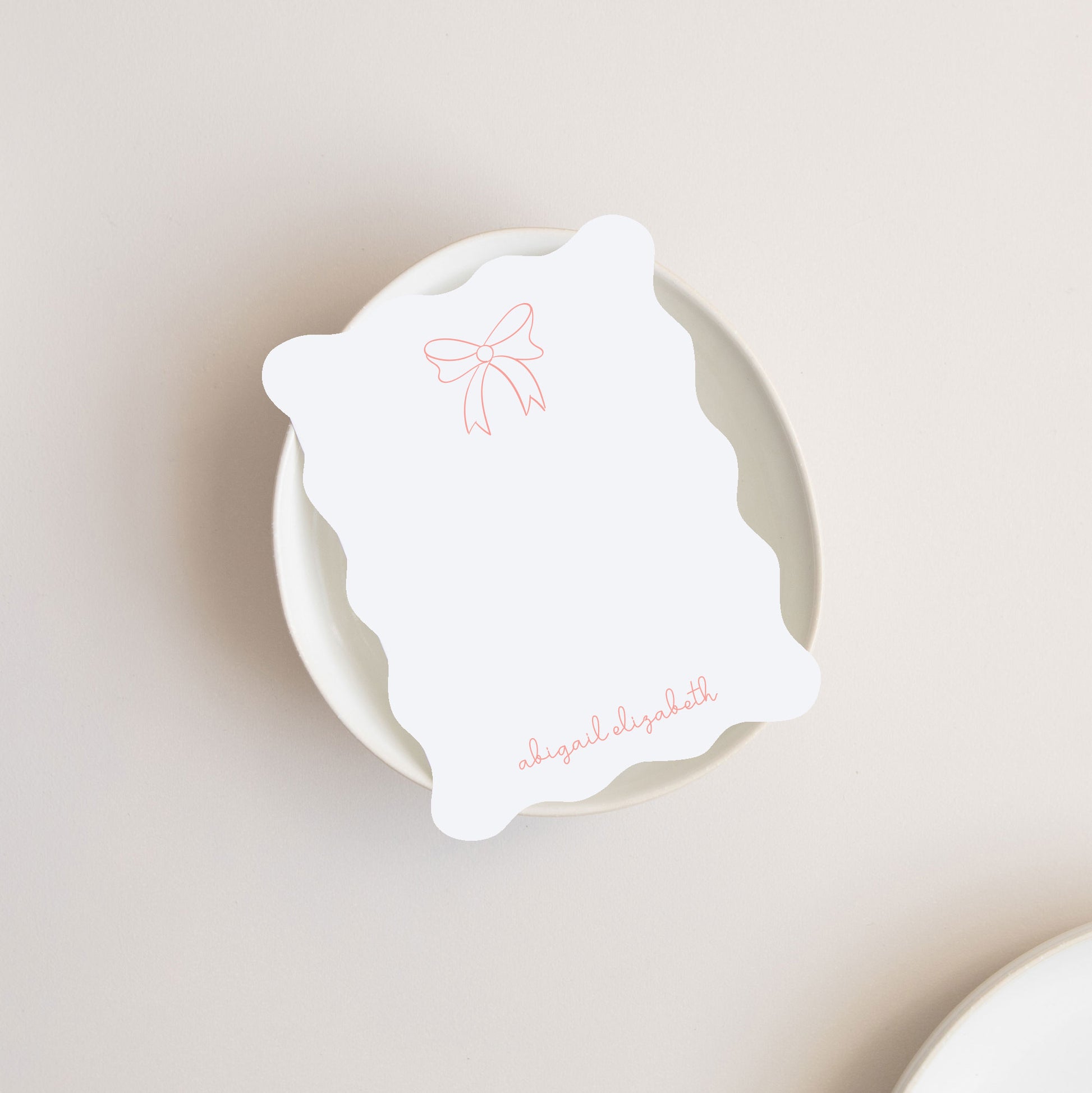 This personalized stationery set features a preppy bow design on a wavey edged note card, adding sophistication and accentuating the curves of the bow. Personalize in your favorite color and add your name at the bottom in an elegant script font.