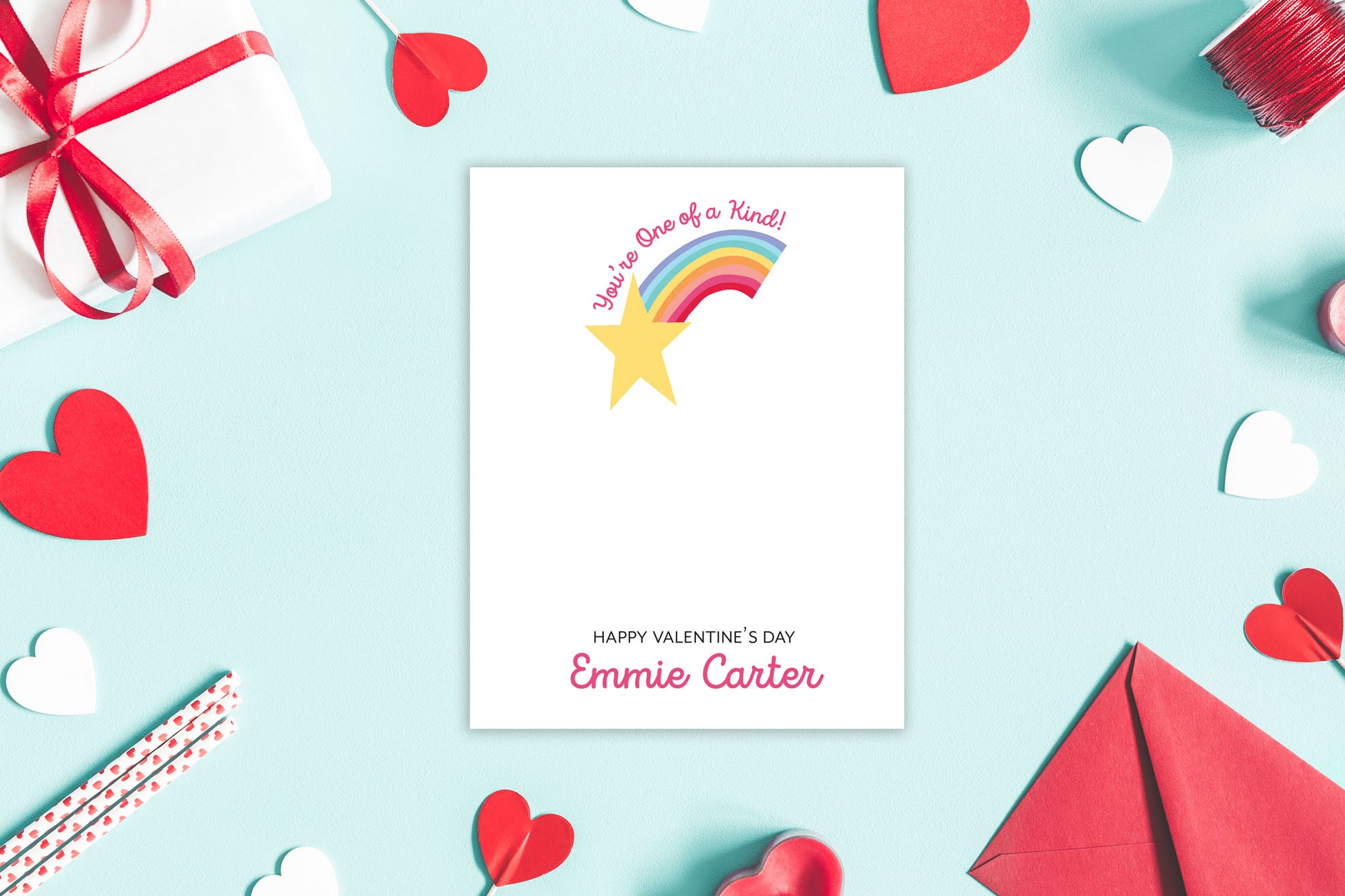 This fun Valentine's Day stationery set features a shooting star with a rainbow tail. "You're one of a Kind" greeting accompany's the illustration. Choose from one of six color options for the name.