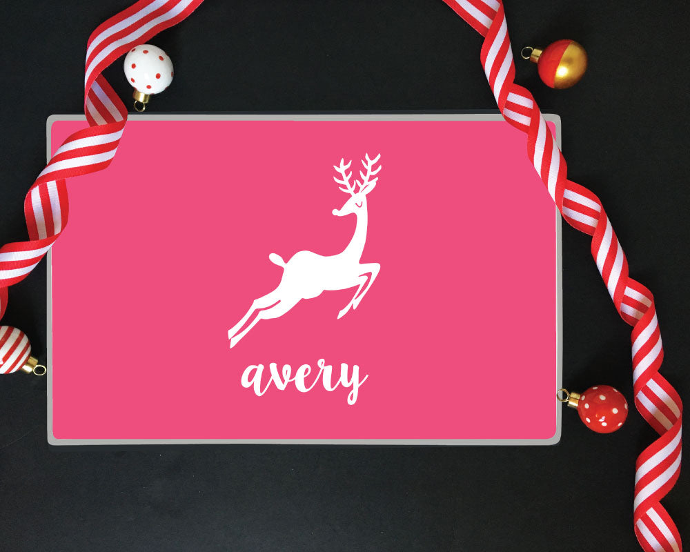 This reindeer silhouette holiday placemat is a fun addition to your holiday table this season. Available in five color options for the background. Personalize with your names underneath in one of three, whimsical font options. Choose all the same color or one in a different color for each family member.