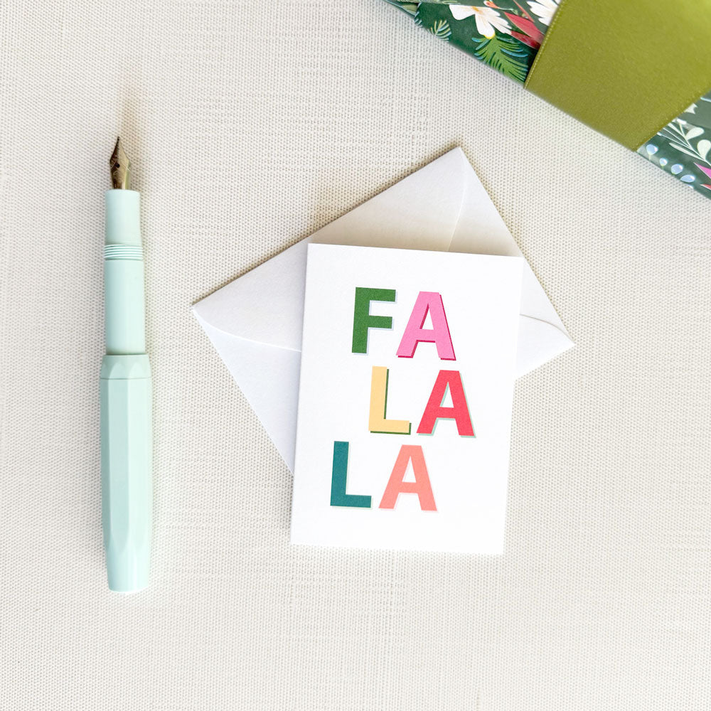Add a touch of retro charm to your gift giving with these mini greeting cards. Featuring fun "fa la la" typography with a jewel tone color palette, these enclosure cards are perfect for the holiday season. Dress up your gift card a with these adorable add-ons.