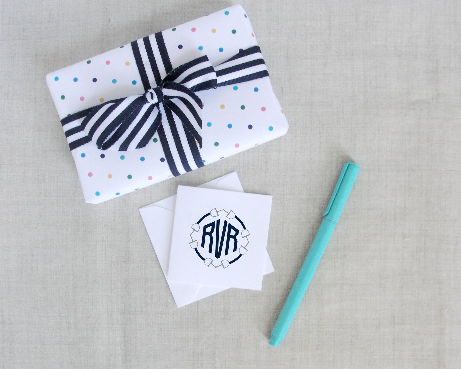 The round snaffle bit monogram enclosure card features your three letter monogram surrounded by a connected D-ring snaffle bit illustration. Select two colors for this equestrian monogram: one for your initials and one for the snaffle bit illustration. Your three letter monogram follows the following format: first, LAST, middle. For example, aCe for Avery Elizabeth Collins.