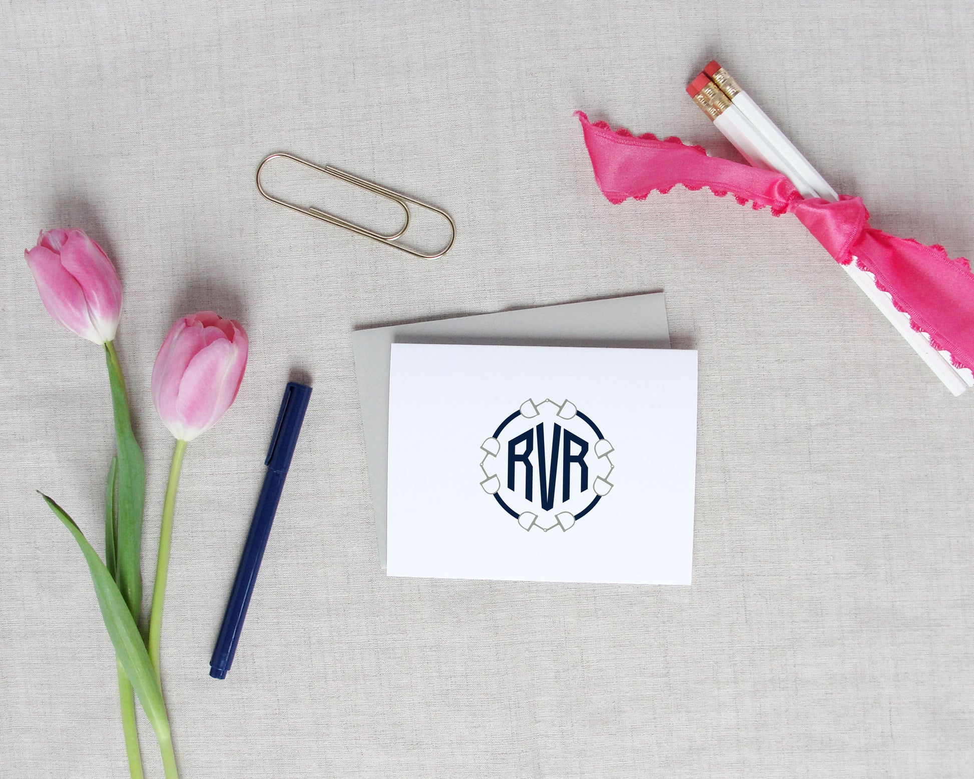 The round snaffle bit monogram folded note card features your three letter monogram surrounded by a connected D-ring snaffle bit illustration. Select two colors for this equestrian monogram: one for your initials and one for the riding crop illustration. Your initials in the three letter monogram follow this format: first, LAST, middle. For example, aCe for Avery Elizabeth Collins.