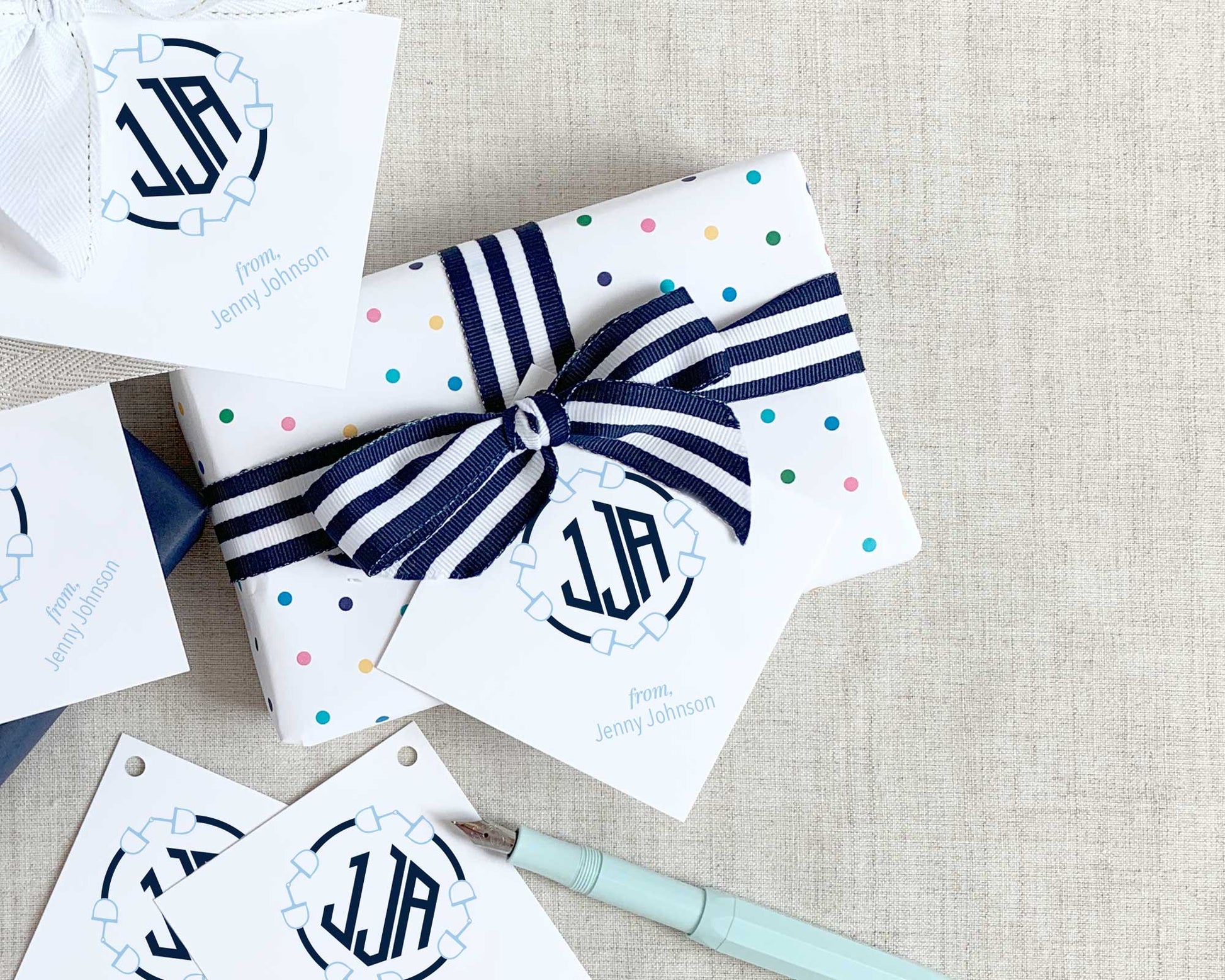 These large, equestrian monogram gift tags are the perfect cherry to the top of your wrapped gift or gift bag. This set of 25 square gift tags are printed so that the monogram and your salutation are angled on a 45 degree. Each gift tag is punched in the upper, left corner.