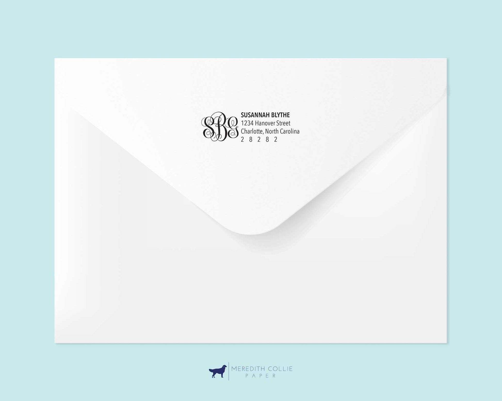 The script monogram return address stamp features your three initial monogram to the left of your full name and address.