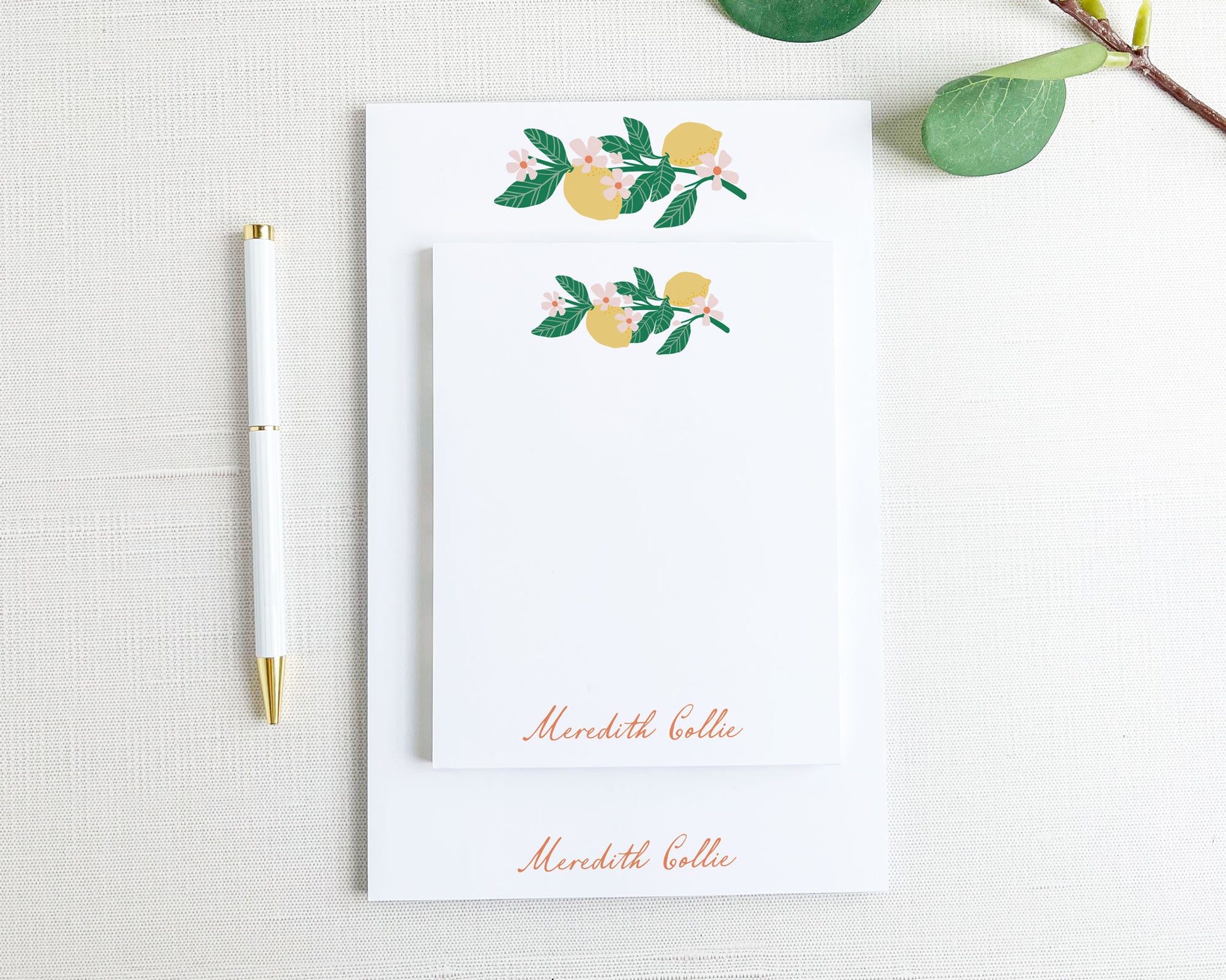 This personalized notepad features a delicate lemon branch and your custom name at the top. Great for lists, notes, or thoughtful gifting. Perfect for list-making, teachers, moms or stationery gifts.