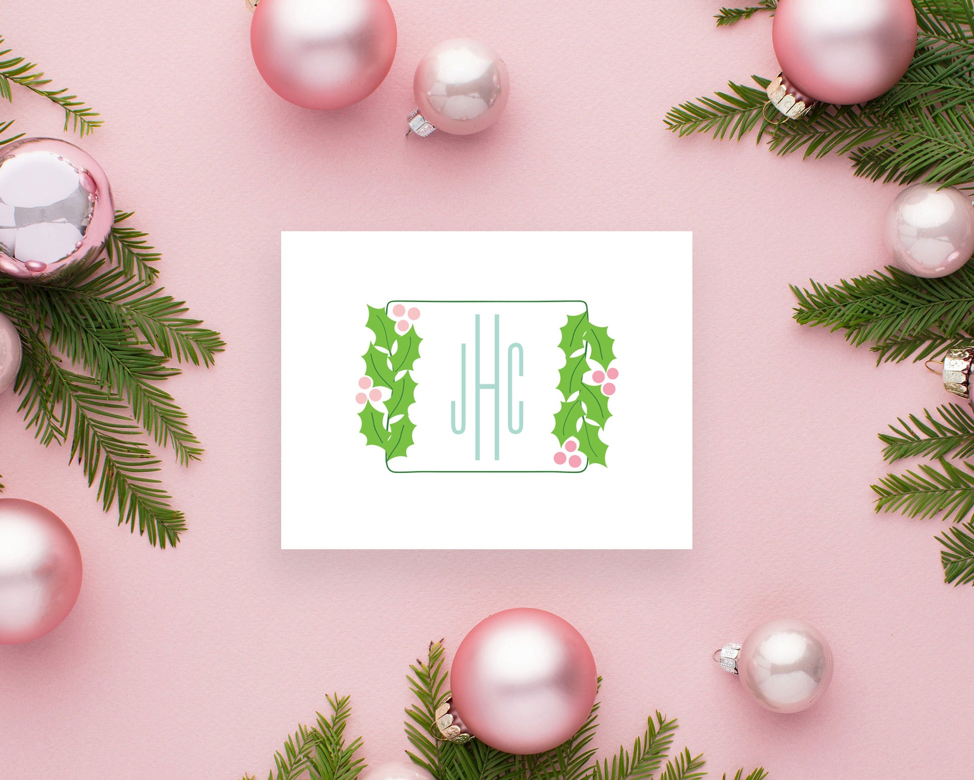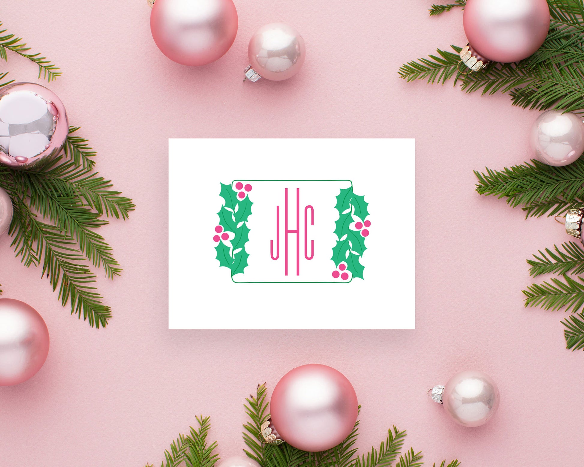 A fun, preppy holiday monogram featuring your three initial monogram encased in a rectangular shape with holly branches on the left and right side. Available in three color options: berry pink, berry red or pastel.