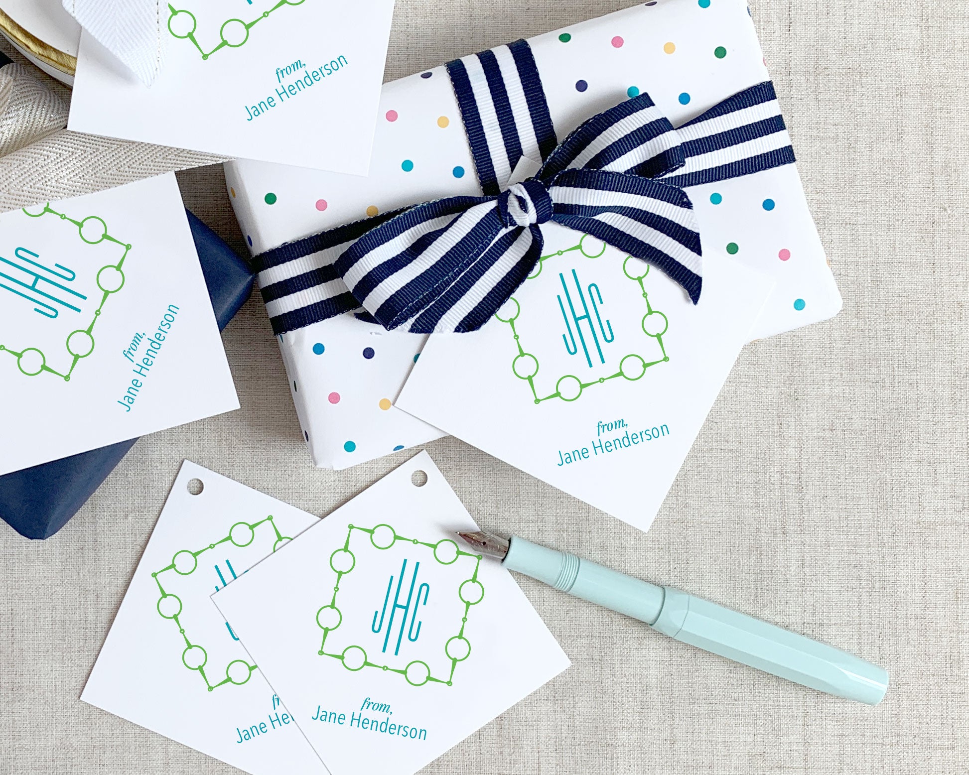 These large, equestrian monogram gift tags are the perfect cherry to the top of your wrapped gift or gift bag. This set of 25 square gift tags are printed so that the monogram and your salutation are angled on a 45 degree. Each gift tag is punched in the upper, left corner.