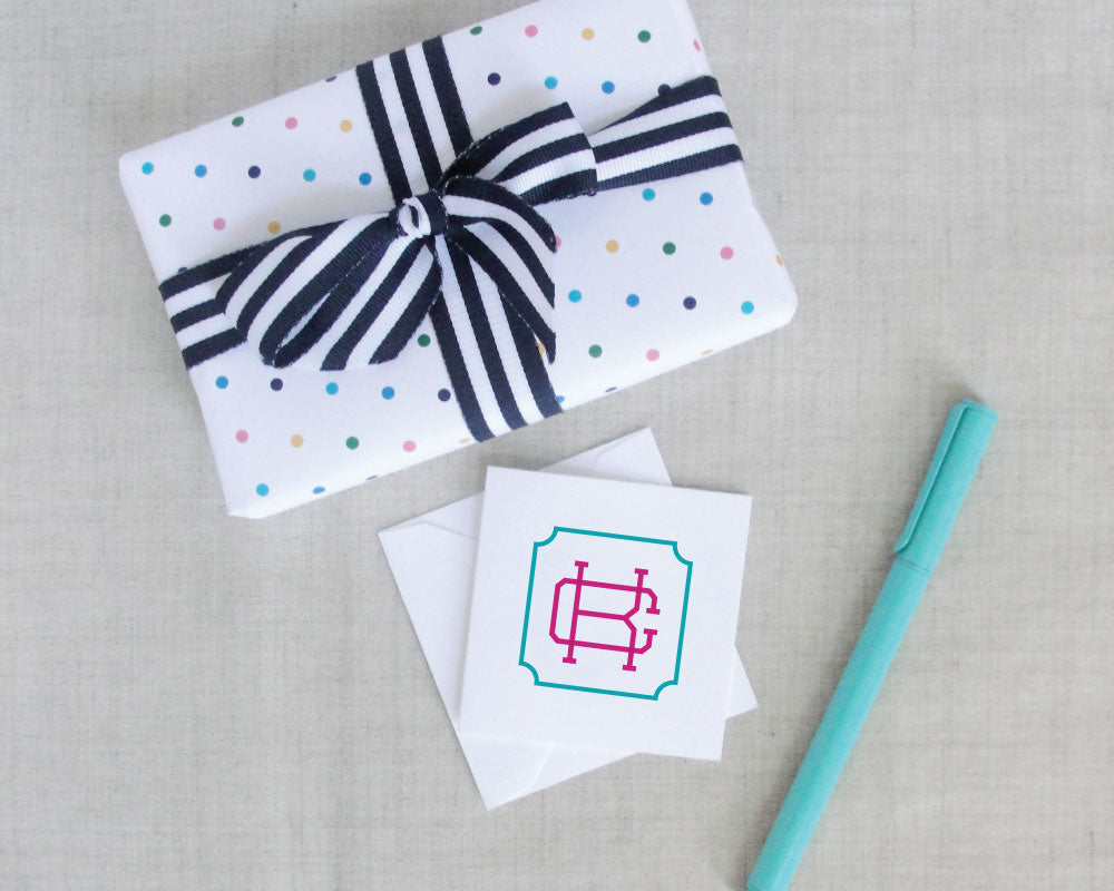 These square monogram gift enclosure cards are perfect for just about everyone! Choose from your choice of two colors to create a unique gift or to express your own style. These little cards are perfect for attaching to birthday presents and gifting as a hostess present.