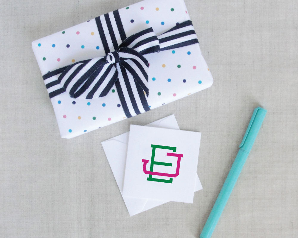 These square monogram gift enclosure cards are perfect for just about everyone! Choose from your choice of two colors to create a unique gift or to express your own style. These little cards are perfect for attaching to birthday presents and gifting as a hostess present.